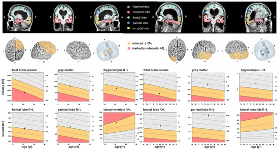 - Comparing the calculated volumes to a reference population of healthy individuals (n = 6099, balanced for gender, mean age 41 ± 23 years, age range 10–97 years, with diverse image sources from Europe, the United States, Australia, and China) to determine percentiles, accounting for age, sex, and total intracranial volume.