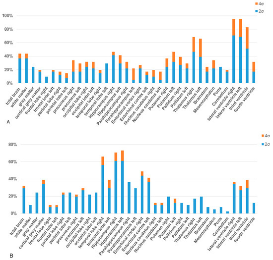 Proportion of subjects with volume deviations among iNPH patients (A) and AD patients (B) is presented. The incidence of these deviations, either by 2 (illustrated in blue) or 4 (in orange) standard deviations, is compared with a healthy, population-based control group embedded in the AI-based volumetric software. The deviations of the supratentorial volumes are provided separately for each side of the brain. Deviations in cortical and subcortical volumes indicate atrophy, whereas deviations in ventricular volumes suggest enlargement.