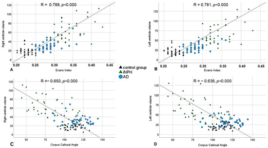 The mean Evans’ index and corpus callosal angle were statistically significantly different between the iNPH, AD, and control groups (Evans’ index: iNPH 0.34 ± 0.04 vs. AD 0.28 ± 0.03 vs. control group 0.23 ± 0.01, p ≤ 0.001; corpus callosal angle: iNPH 82.22 ± 22.12 vs. AD 117.60 ± 15.23 vs. control group 111.59 ± 9.59, p ≤ 0.001). As graphically illustrated in Figure 4, the total ventricle volume of the iNPH patients and the measured Evans’ index and corpus callosal angle were found to correlate moderately (Evans’ index: right lateral ventricle r = 0.788, p = 0.000, and left lateral ventricle r = 0.781, p ≤ 0.001; corpus callosal angle: right lateral ventricle r = −0.650, p ≤ 0.001, and left lateral ventricle r = −0.636, p ≤ 0.001).
