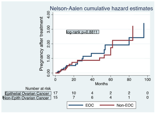 Pregnancy outcomes have not been influenced either by type of conservative surgery or need for adjuvant chemotherapy. Miscarriages were reported in four (7.8%) cases, which is lower than usual. Route of delivery was determined by obstetrical factors only, with no higher percentage of cesarean section than in routine obstetric practice. As for pregnancy complications, only one case of gestational diabetes was described, which is a frequent complication in standard pregnancies, without higher rates described in cancer survivors in our study. Published data considering implications of cancer treatments in pregnancy complications are heterogeneous. Cancer survivors have increased rates of endocrine, cardiac or pulmonary disorders, due to treatment but also to increased age; those disorders are probably related to increased morbidities in pregnancy [37]. Women who attempt pregnancy after cancer have higher risk of gestational morbidities such as abortion, preeclampsia, gestational diabetes and cesarean section compared with the non-cancer group, but those factors are also strongly related to age [38,39]. Neonatal morbidities are also increased, such as intrauterine growth restriction, low weight at birth, preterm delivery and low Apgar score [40]. Cesarean delivery is more frequent in patients diagnosed with cancer, although the explanation needs further investigation; it may be due to the increase in pregnancy morbidities in those patients or to fear of birth trauma. Furthermore, pregnancies do not impoverish patients’ self-prognosis nor have influence on recurrences. We report 12 (8%) recurrences after fertility-sparing procedures, and only one (0.66%) was after a term pregnancy and delivery. The patient had a complete response to treatment. Finally, death due to ovarian cancer was reported in four patients, two with EOC and two with non-EOC (Figure 3); none of them had pregnancies.
