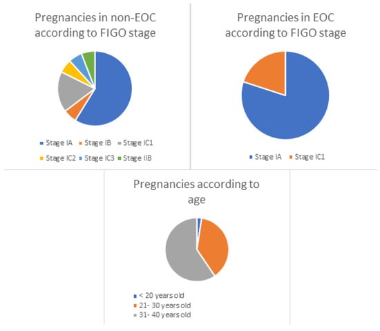 Considering the treatment performed among the patients who obtained term pregnancies, 31 (73.8%) patients underwent only surgery and 11 (26.2%) underwent surgery and adjuvant chemotherapy. Adjuvant chemotherapy was more frequent in non-EOC patients than in EOC patients, with eight patients in the non-EOC group undergoing adjuvant chemotherapy vs. three patients with EOC.