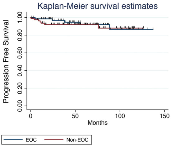 A total of 150 patients were included in the study, including 70 (46.6%) with EOC and 80 (53.4%) with non-EOC. The mean age of the patients was 28.57 years old, with a mean tumoral size of 108.2 cm. Considering FIGO stage, 143 (95.3%) patients were stage I, divided into 99 (66%) stage IA, 5 (3.3%) IB, 30 (20%) IC1, 6 (4%) IC2 and 3 (2%) IC3. The remaining 7 (5%) patients were stage II, with 2 (1.3%) patients being stage IIA and 5 (3.3%) IIB. All patients underwent conservative procedures, which included surgery in all cases, followed by adjuvant chemotherapy if recommended based on clinical guidelines. Fertility-sparing surgery was not a standard procedure, since the extension of surgery was highly influenced by histology; FIGO stage and institution´s protocol also played a role in its planification. After surgery, 51 (34%) patients required adjuvant chemotherapy, corresponding to 19 (37.2%) patients in the EOC group and 32 (62.8%) patients in the non-EOC group. None underwent neoadjuvant chemotherapy.