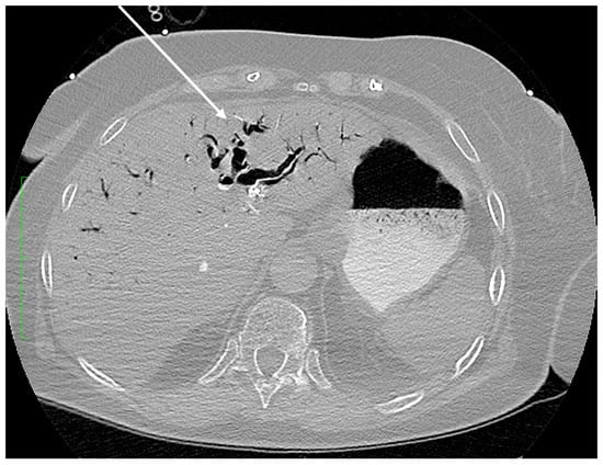The pathway of CO2 gas transmission also occurs by the biliary tract; the gas then enters the vessels of the circulatory system through the injured endothelium. The pathomechanism and incidence of this complication are multifactorial. The type of endoscopes used and the working pressure of the gas used, the type of intervention, the presence of biliary-venous fistulas, the state of the mucosal barrier, previous endoscopic interventions or the presence of implanted foreign materials are all significant []. All these factors result in a breach of the endothelial and tissue barrier with the transmission of gas into the vascular system—the portal vein runoff or the hepatic venous system. Figure 1 shows bile ducts filled with gas. The transmission of CO2 into the superior vena cava system occurred via damage to the endothelial tissue barrier between the bile ducts and the hepatic veins.