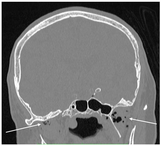 Coronal plane of the head’s CT scan. Gas bubbles are detected in the lumen of blood vessels of the face and intracranially (arrows).