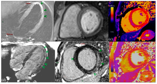 - Ferreira, V.M.; Schulz-Menger, J.; Holmvang, G.; Kramer, C.M.; Carbone, I.; Sechtem, U.; Kindermann, I.; Gutberlet, M.; Cooper, L.T.; Liu, P.; et al. Cardiovascular Magnetic Resonance in Non-ischemic Myocardial Inflammation: Expert Recommendations. J. Am. Coll. Cardiol. 2018, 72, 3158–3176. [Google Scholar] [CrossRef] [PubMed]