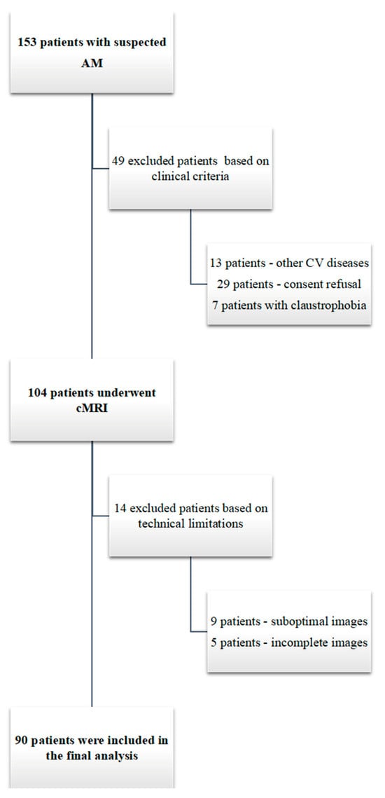 From the initial study population of 153 patients, patients with suboptimal cMRI images, those who refused to undergo the second cMRI, and those diagnosed with other acute myocardial diseases were excluded (Figure 2). The final study population comprised 90 patients with AM (69 men, average age = 35 ± 14.1 years).