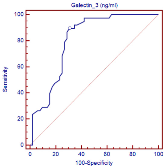 The ROC analysis for identifying myocardial fibrosis (Figure 3) demonstrated an area under the curve of 0.807 (95% CI = 0.710–0.882; p < 0.0001) for Gal-3. The determined cutoff value was >12.2 ng/dL, yielding a sensitivity of 89.47%, a specificity of 69.23%, a positive predictive value of 68%, and a negative predictive value of 90%.