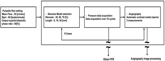 Experimental protocol. The stenosis model is changed while maintaining constant pulsatile flow. Pressure data are collected for FFR measurements, and coronary angiography is performed. BPM, beats per minute; FFR, fractional flow reserve.