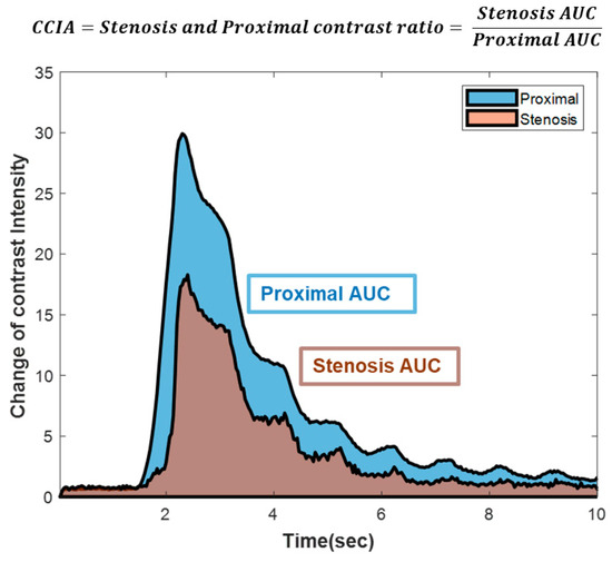 Coronary angiography images were acquired using the same in vitro coronary circulation system, utilizing nine distinct stenosis models with varying degrees of stenosis and stenotic lengths. These images were processed offline using MATLAB (version 2021a, Mathworks, Natick, MA, USA) to calculate the AUCs for the CCIA. The stenotic area was defined as the region in which the blood vessel narrows before returning to its normal width in the angiography. The proximal area was defined as a region equal in size to the stenotic area, beginning 10 mm from the end of the stenotic area. Angiography images encompassing both the proximal and stenotic areas were captured for 10 s, starting before the injection of the contrast agent and lasting until the contrast agent dissipated. The change in the contrast intensity over time initially peaked after the injection of the contrast agent and then gradually decreased. The CCIA value was derived by calculating the ratio of the values of the AUC in each respective area, as shown in Figure 3.