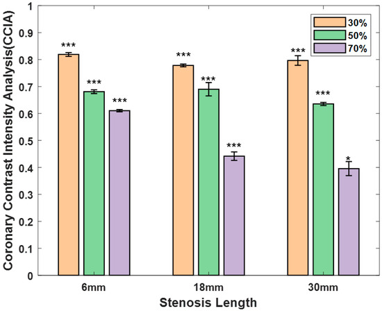 Figure 5 outlines the average CCIA values based on the stenosis length and severity, along with the standard deviations, to provide a comprehensive view of the results. For a stenosis length of 6 mm, the CCIA values exhibited the following patterns: with 30%, 50%, and 70% stenoses, the CCIA values were 0.82 (±0.007, n = 3, p < 0.001), 0.68 (±0.007, n = 3, p < 0.001), and 0.61 (±0.004, n = 3, p < 0.001), respectively. For stenosis lengths of 18 mm, the CCIA values were 0.78 (±0.052, n = 3, p < 0.001), 0.69 (±0.025, n = 3, p < 0.001), and 0.44 (±0.016, n = 3, p < 0.001) with stenoses of 30%, 50%, and 70%, respectively. For stenosis lengths of 30 mm, the CCIA values were 0.80 (±0.018, n = 3, p < 0.001), 0.64 (±0.006, n = 3, p < 0.001), and 0.40 (±0.026, n = 2, p < 0.05) with stenoses of 30%, 50%, and 70%, respectively. As shown in Figure 5, the CCIA values showed a trend similar to the FFR values. However, although the CCIA was related to the stenosis degree, it was less related to length, except for with 70% stenosis (for 70% stenosis, 6 mm length: 0.61 ± 0.004; 18 mm: 0.44 ± 0.016; 30 mm: 0.40 ± 0.026).