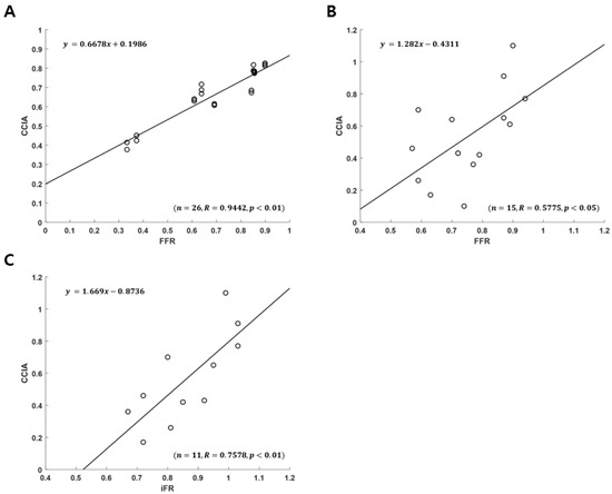 Analysis of clinical data from 15 patients revealed significant correlations between CCIA and both FFR (R = 0.5775, p < 0.05) and the iFR (n = 11, R = 0.7578, p < 0.01). Detailed results, including the vessel type and the CCIA, iFR, and FFR values, are presented in Table 2.