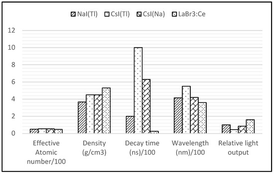 Along with the trend towards creating compact and preferred systems for small-field-of-view configurations (with non-dead edges), pixelated detectors have been integrated into gamma-camera designs [3,4]. Predominantly, these detectors utilise scintillating materials, which offer numerous advantages, including high intrinsic efficiency and low fabrication costs with various shapes and sizes [3,8,9]. The physical properties of the scintillators, namely NaI(Tl), CsI(Tl), CsI(Na), and LaBr3:Ce, are presented in Figure 2 [8]. These scintillating materials exhibit similar photopeak efficiencies due to their comparable effective atomic numbers and densities. The detectors’ counting rate capacity is limited by the scintillation’s persistence, while counting-rate losses with SPECT are rarely an issue when conventional collimation is employed.