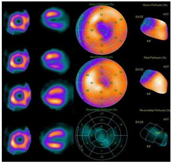 Short and horizontal long-axis SPECT images of stress (first and second rows in the first and second columns) and rest (third and fourth rows in the first and second columns) myocardial perfusions. The stress and rest myocardial perfusion scans show partial reversible perfusion defects in the apex, apico-anterior, apico-lateral and apico-inferior segments. The polar maps and rendered images of stress, rest, and irreversible perfusion in the third column (top, middle, and bottom), respectively, illustrate the hypo-perfused areas and their perfusion scores using the 16-segment model.