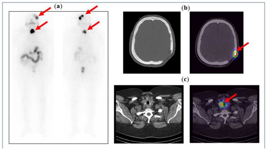 (a) Anterior and posterior whole-body images of the post-therapy iodine scan showing iodine uptake in the neck and the left side of the skull. Physiological tracer distribution is seen in the salivary glands (as pointed out by the arrows), stomach, bowel loops, and urinary bladder. (b) CT and fused SPECT/CT images of the skull showing an osteolytic lesion with tracer uptake along the post-operative margin in the left parietal bone. (c) CT and fused SPECT/CT images of the neck clearly show tracer uptake in the residual tissue in the neck (seen as hot spots on the image on the right).