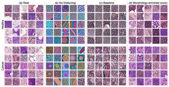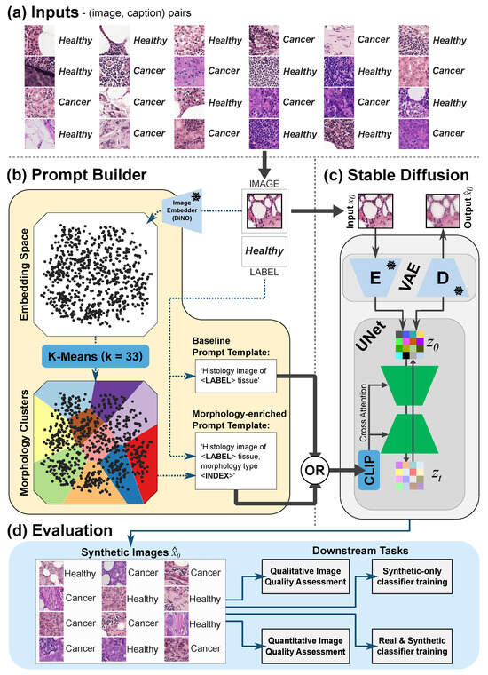 For this purpose, Patch Camelyon (PCam) [36,37,38], a dataset composed of 96 × 96 px patches extracted from WSIs of lymph node sections, was selected. Each patch is loosely annotated with a binary label indicating the presence or absence of metastatic tissue, and no WSI-level reports are provided. Then, a pretrained image encoder model (DiNO [39]) was leveraged to capture rich cellular configurations, overarching tissue structures, and distinctive pathological landmarks in the image patches, independently of the exhaustiveness of the dataset’s annotations. The outputs of the DiNO model were postprocessed using a k-means clustering algorithm to agglomerate similar data points based on feature similarity, facilitating the generation of informative prompts/captions (e.g., “Histology image of healthy tissue, morphology type five”). These prompts are in turn utilized as richer inputs for fine-tuning a pretrained LDM model (the open-source Stable Diffusion [21] model pretrained on natural images [40]), thereby better representing the data distribution captured by the model.