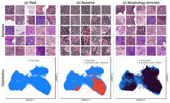 Randomly selected subset of 25 samples for the real (a), baseline (b), and morphology-enriched (c) datasets. The rightmost column depicts the coverage comparison of the real data distribution between the two synthetic datasets. The manifold representation is generated based on Inception-V3 latents with a 2D UMAP transform.