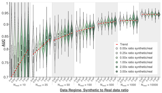 Concretely, we conducted experiments of adding synthetic data generated via the proposed method in different proportions and in 7 different training data regimes. Each data regime corresponds to an initial amount of real data and spanned over the following range of values: 10, 25, 50, 100, 500, 1000, and 10,000 real samples. For each data regime, we then added synthetic samples to the training data in 6 different ratios with respect to the initial amount of real data: 0%, 25%, 50%, 100%, 200%, and 300%. These data are sampled in a balanced fashion from the previously mentioned 50 k synthetic dataset generated via our proposed method.