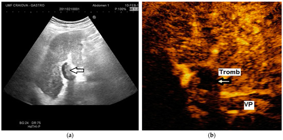 - Danila, M.; Sporea, I.; Popescu, A.; Șirli, R. Portal vein thrombosis in liver cirrhosis—The added value of contrast enhanced ultrasonography. Med. Ultrason. 2016, 18, 218–233. [Google Scholar] [CrossRef][Green Version]