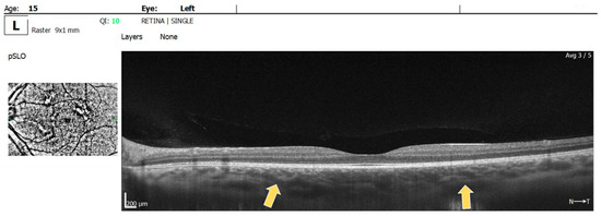 OCT scan of the LE: arrow showing a hyperreflective area in the nerve fiber layer and ganglion cell layer.