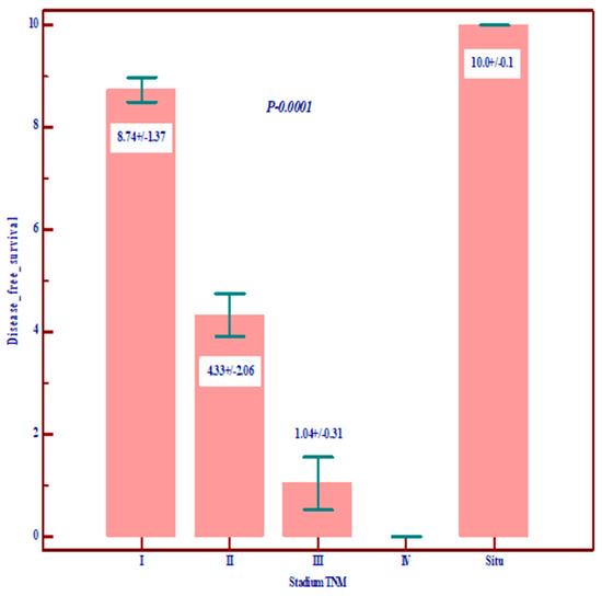 The relationship between TNM stage and overall survival (OS) and disease-free survival (data are expressed as mean and standard deviation).