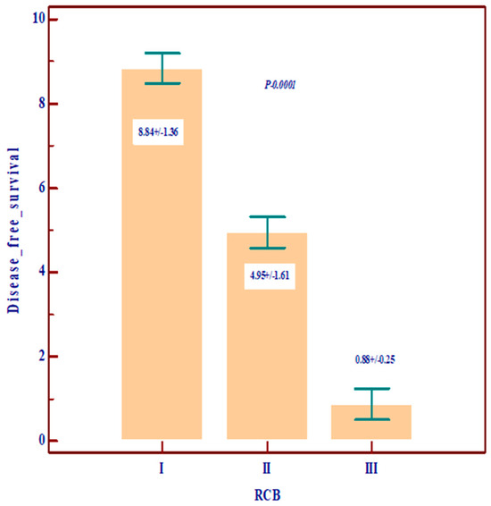 Regarding the prognostic value, we noted that Nottingham grade 3 and TNM stages III and IV are correlated with low overall survival (OS) and disease-free survival (DSF), with a poor prognosis, and, among the molecular variables, the most important prognostic role is played by residual cancer burden (RCB) (Figure 1, Figure 2 and Figure 3).