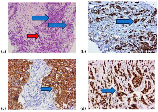 Histological images of breast cancer: (a) infiltrative ductal breast carcinoma placards (blue arrows) and trabecules (red arrow), (b) immunohistochemical reaction for estrogenic receptors (blue arrow), (c) immunohistochemical reaction for HER2 (blue arrow), (d) immunohistochemical reaction for progesteron receptor (blue arrow).