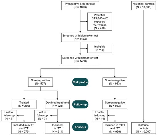 At study termination, 1873 eligible individuals had been enrolled in the prospective arm, 1460 of whom were eligible, aligned with pre-COVID-19 criteria, and had been screened with the biomarker test (Figure 1). Of these, 34.7% (507/1460) were screened as positive by the test. Among screened individuals, 83.4% (1218/1460) had clinical outcomes and were either screen negative (77.1%, 939/1218) or screen positive and accepting of treatment (22.9%, 279/1218). The prospective arm outcomes were compared to those for 10,000 consecutive historical controls selected from an approximately two-year period immediately preceding the study initiation. The primary and secondary hypotheses were tested in the mITT population. The sensitivity analyses were evaluated in the ITT population.