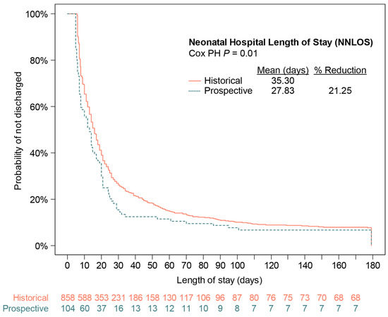 Both co-primary endpoints met statistical significance. Within the entire mITT population, the NMI scores were significantly reduced in the prospective vs. the historical arm (OR 0.81, 95% CI 0.67–0.98, p = 0.03) (Table S3). Specifically, the probability of severe NMI (NMI ≥ 3) was reduced by ~18%, across a range of covariate values (Table S4). NMI ≥ 1 (any impairment) decreased by 13–17%. For NNLOS, the control arm had an observed PTB rate of 7.1%; therefore, the 8.5% quantile (1.2 times the control PTB rate) of longest stays was used in the analysis. In this quantile, NNLOS was significantly reduced in the prospective arm vs. the historical arm (HR 0.73, 95% CI, 0.58–0.92, p = 0.01) (Table S3). The Kaplan–Meier plot for NNLOS (Figure 2), reflects a 21% reduction in mean NNLOS. Neither the proportional odds assumption for ordinal logistic regression nor the PH assumption for Cox regression were violated.