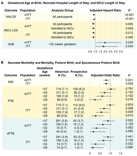 Co-primary and co-secondary outcomes in the prospective arm relative to historical controls for the mITT and ITT populations. Ratios are adjusted for parity, maternal age, and opioid use. (A) Hazard ratios below one reflect shorter neonatal hospital length of stay (NNLOS), or neonatal intensive care unit (NICU) length of stay (NICU LOS). Hazard ratios above one correspond to prolonged gestational age at delivery (GAB) relative to historical controls. (B) Odds ratios below one reflect decreased neonatal morbidity and mortality (NMI), preterm birth (PTB), and spontaneous preterm birth (sPTB) rates relative to historical controls. Solid vertical lines indicate the null value of the ratio (1.0).