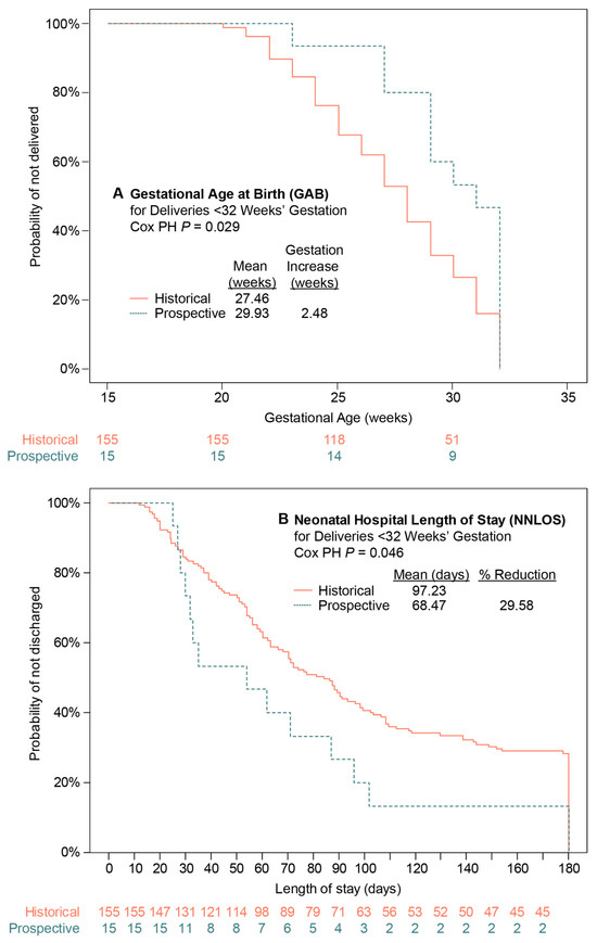 In the exploratory analyses, the odds of PTB and sPTB at various gestational age cutoffs were either significantly reduced or showed trend in the direction of a benefit in both the mITT and ITT populations (Figure 3B). Due to the decreases observed in the odds of PTB, particularly for the earliest gestational age cutoffs, GAB amongst births <32 weeks’ gestation was evaluated. Although GAB was not significantly different in the secondary analyses, the mean GAB for deliveries <32 weeks’ gestation was prolonged in the prospective vs. the historic arm in both the mITT and ITT populations (Figure 3A). The survival analysis illustrates the GAB shift (HR, 1.94, 95% CI, 1.07–3.52, Cox PH p = 0.029) (Figure 4A), corresponding to a 2.5-week extension of mean gestation (29.93 and 27.46 weeks for prospective and historical arms, respectively). Prospective arm neonates born <32 weeks’ gestation left the hospital earlier than those in the historical arm did (HR, 0.54, 95% CI 0.30–0.99, Cox PH p = 0.046), with mean NNLOS differences of approximately 30% (mean of 68.47 and 97.23 days for prospective and historical arms, respectively) (Figure 4B).