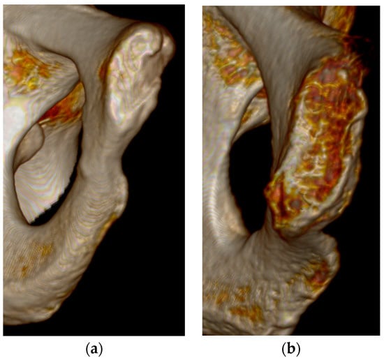 The CT scans were downloaded from the NMDID and were processed using the 64-bit OsiriX Imaging Software version 13.0.2 (Pixmeo, Geneva, Switzerland). OsiriX is an advanced open-source PACS workstation DICOM viewer (obtainable at www.osirix-viewer.com accessed on 10 July 2024). The software easily renders CT scans into a three-dimensional image that allows for further manipulation of the scans, including rotation, positioning, and surface- and volume-rendering capabilities. The three-dimensional images were created using the volume-rendering function with the “low-contrast” preset, as this was determined to be the best preset for viewing features of the pubic symphysis. However, in some cases, the “mid-contrast” preset was needed due to increased levels of porosity in some individuals.
