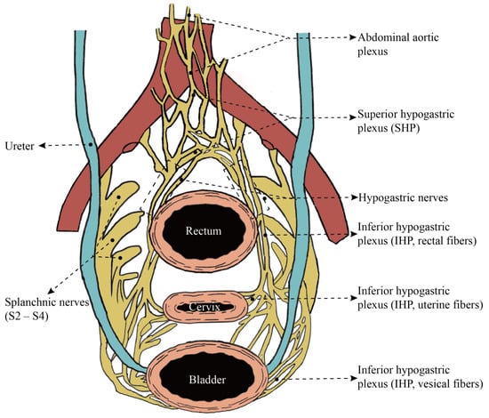 The superior hypogastric plexus (SHP) and hypogastric nerves are the main sources of sympathetic innervation to the pelvic organs. The SHP is formed by the continuation of the abdominal aortic plexus, located below the abdominal aortic bifurcation, in the region between the two common iliac arteries [28]. Its lower end extends approximately to the level of the sacral promontory, where it bifurcates into paired hypogastric nerves [28,29]. The left and right hypogastric nerves extend downward to the pelvic floor, on the medial side of the ureter and the lateral side of the uterosacral ligament in Okabayashi’s space [28,30], and combine with splanchnic nerves from S2 to S4 to form the inferior hypogastric plexus (IHP) [28,29]. The IHP sends out branches to supply the physiological functions of the rectum, uterus, vagina, and bladder, including the rectal fibers, uterine fibers, vaginal fibers, and vesical fibers (Figure 2). Among the areas of the human uterus, the nerve fibers of the cervix are the most densely distributed [31,32,33]. Specifically, the cervix exhibits a preference for certain types of nerves, with 79% TH+ autonomic sympathetic fibers, 73% NPY+ sensitive fibers, and 13% VIP+ parasympathetic fibers [32]. The abundant neural innervation results in the highest concentration of almost all neurotransmitters in the uterine cervix compared to the fundus and uterine body [31,33]. These neurotransmitters are involved in pain, vascular formation, and the constriction of pregnancy and childbirth [33]. For cervical cancer patients eligible for Type C1 surgery, excision should be carried out close to the organ to avoid damaging the IHP located on both sides of the organ, thus minimizing the risk of postoperative organ dysfunction.