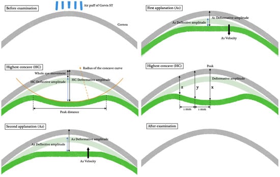The Corvis ST is a non-contact corneal biomechanical analyzer providing a direct assessment of dynamic corneal response (DCR) [18]. The Corvis ST consists of an air puffer, producing a fixed-pressure air jet to deform the cornea, and an ultra-high-speed camera to capture the deformation process with serial images. Tonometry and pachymetry can also be visualized with great precision based on the Scheimpflug images. The Corvis ST with software version 1.6r2031 was adopted in our study. We defined the parameters that can be directly measured from the serial images as “Basic Parameters”, which were further divided into the indices at the first applanation (A1), the second applanation (A2), highest concavity (HC), and of limit (Figure 1). On the other hand, the parameters that required further calculation with basic parameters and patient-specific characteristics were referred to as “Integrated Parameters”, including the latest released stress-strain index (SSI).