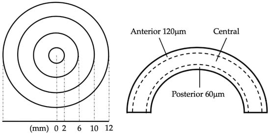 The Pentacam AxL® (Pentacam; Oculus, Wetzlar, Germany) is a versatile machine for corneal densitometry and optical pachymetry [19]. We extracted COD and CT to assess the quality of the cornea. Corneal densitometry quantified the backscattering light from the exact position within the cornea as its COD. The whole corneal was divided into four concentric annuli centered on the thinnest point of the cornea (0–2 mm/2–6 mm/6–10 mm/10–12 mm in diameter) and three layers (anterior 120 μm/central/posterior 60 μm) for COD assessment (Figure 2) [19]. For a closer look at the clear cornea incision wound, we averaged the two COD values at the temporal-peripheral site of the densitometric map to represent the incision site [14]. CT was measured with corneal tomography, which reconstructed the three-dimensional cornea and created a pachymetric map after assessing its anterior and posterior surface [20]. CT was also evaluated in concentric annuli. The annuli had diameters ranging from 0.0 mm to 12.0 mm, with increments of 0.4 mm per annulus, depicting a spatial profile of CT.