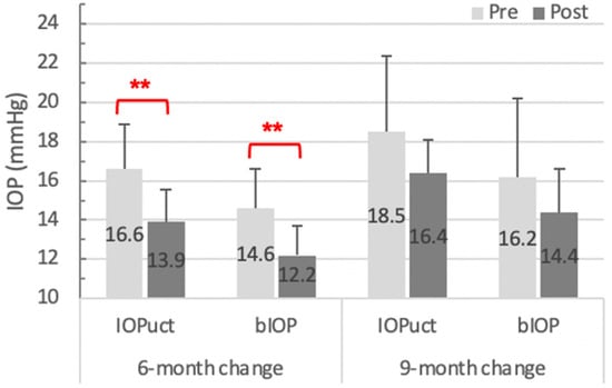 IOP changes in different follow-up periods. The 9-month change of both IOPuct and bIOP lost significance (p = 0.09, p = 0.12, respectively) when compared with the 6-month change (both p < 0.001). Significant differences defined as p < 0.05 were highlighted with **. Abbreviation: IOP, intraocular pressure; IOPuct, uncorrected IOP; bIOP, biomechanics-corrected IOP.