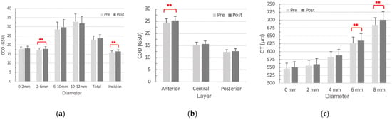Changes of COD and CT 6 months after a cataract surgery. (a) COD of total thickness showed a significant postoperative increase in the 2–6 mm annuli and incision site. (b) The anterior 120 μm depth was the only significantly increased layer of COD in 2–6 mm annuli. (c) The significance of CT changes remained in the peripheral cornea. Significant differences defined as p < 0.05 were highlighted with **. Abbreviation: COD, corneal optical density; GSU, grayscale unit; CT, corneal thickness.