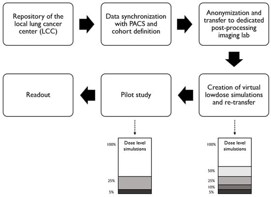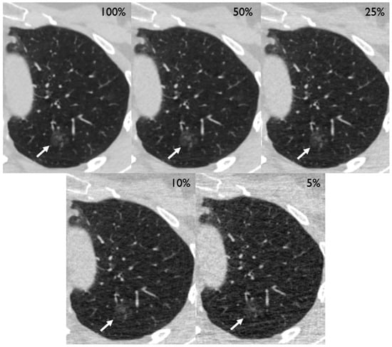 The anonymized examinations were transferred to a dedicated post-processing imaging lab specialized in LDCT simulations. The reduced dose simulations were produced by adding statistical noise to the images using a previously described CT image-based noise addition tool []. Four reduced dose level simulations were created out of every CT scan, leading to five different dose levels for each examination: 100% (original), 50%, 25%, 10%, and 5% doses.