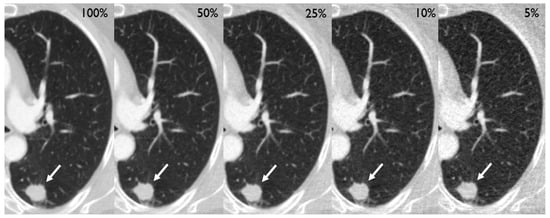 Still, an immanent issue with LCS is the exposure to ionizing radiation. Therefore, the optimization of screening CT protocols plays a key role in the field and has driven numerous investigations in the past. In particular, in the past decade, with the introduction of iterative reconstruction algorithms [] and highly efficient detector assemblies, LDCT has become a reality that is already in broad clinical use, especially in the field of LCS, with the UK currently leading the way [,,,].