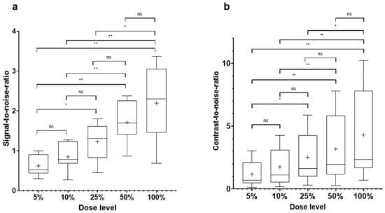 Results of the pilot study: comparison of the different dose level simulations regarding SNR (a) and CNR (b) depicted as boxplots (min–max). CNR, contrast-to-noise ratio; SNR, signal-to-noise ratio; ns, non-significant; *, significant (p < 0.05); **, highly significant (p < 0.01).