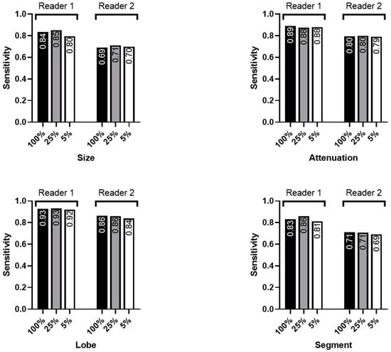 Reader sensitivities regarding the correct categorization of nodule size, nodule attenuation, lobar, and segmental localization by the reader.