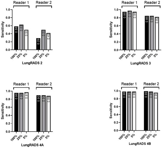 Regarding the relevant subgroup of subsolid nodules (n = 49), reader 1 achieved sensitivities of 93%, 96%, and 93% for the three dose levels, while reader 2 achieved sensitivities of 86%, 89%, and 86%, respectively.