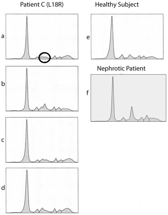 Given the second peak in the serum electrophoresis is mainly composed of the A2M protein, our focus turned to studying the A2M protein in patient C, who had a Leu18Arg missense mutation within the signal peptide of the protein (Figure 1). Of interest, we noted a patient-specific, unusual bipartite alpha-2 fraction in the serum electrophoresis (marked as circle in Figure 1a), which changed its distribution over the course of the disease (Figure 1a–d). In this context, the second peak was initially larger, but later leveled off as proteinuria decreased. For comparison, serum electrophoresis of a healthy donor and of a nephrotic patient are depicted in Figure 1e,f, respectively.