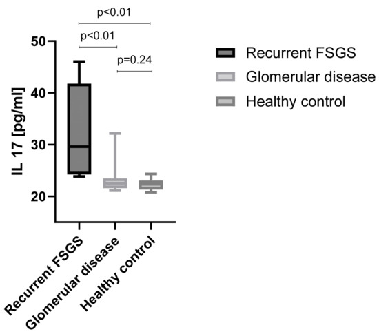 Therefore, to test for differences at the protein level, IL-17 levels were measured in kidney transplant recipients with recurrence of FSGS, in patients with other glomerular diseases, and in healthy individuals by commercially available ELISA. This revealed increased plasma IL-17 levels in patients with recurrence of FSGS (32.30 ± 9.12 pg/mL; n = 6) versus glomerular disease (23.16 ± 2.49 pg/mL; p < 0.01; n = 45) and healthy subjects (22.28 ± 0.94 pg/mL; p < 0.01; n = 26) (Figure 3).