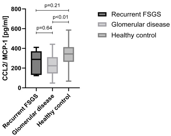 As an important representative of chemotaxis regulation, the CCL2/MCP-1 chemokine was measured by ELISA in our cohort. Although CCL2/MCP-1 exhibited significantly lower plasma levels in patients with glomerular diseases (237.6 ± 110.5 pg/mL; n = 36) compared to healthy subjects (341.5 ± 112.6 pg/mL; p < 0.01; n = 31), there was no difference between patients with FSGS recurrence after kidney transplantation (266.9 ± 118.0 pg/mL; n = 6) and those with glomerular diseases or healthy subjects (p = 0.64 and p = 0.21, respectively) (Figure 4).