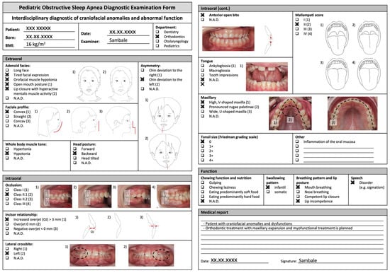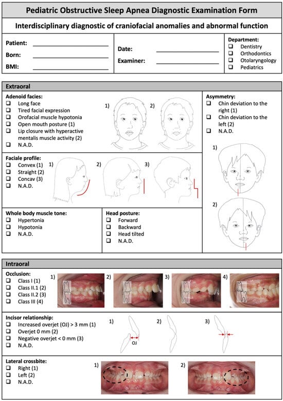 Therefore, we aimed to present our novel Pediatric Obstructive Sleep Apnea Diagnostic Examination Form (POSADEF), which is designed to provide interdisciplinary standardization in the clinical examination of children with OSA. The successful multidisciplinary treatment of a young girl with OSA and underlying craniofacial anomalies and orofacial dysfunctions illustrates the significance of interdisciplinary collaboration.