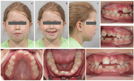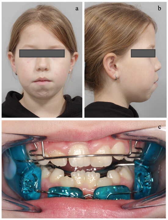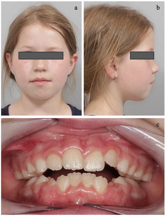 The extraoral and intraoral results after FR-2 treatment are presented in Figure 6. The facial profile benefited both from maxillary expansion with jumping-the-bite of the mandible and from the FR-2 with functional harmonization of the orofacial muscle tone (Figure 6b). Tongue posture was improved, and the maxillary width remained stable (Figure 6c). Since this treatment was an early orthodontic intervention, it aimed to correct the skeletal jaw relationships accompanied by myofunctional therapy to ensure the physiological growth of the jaw. Subsequent orthodontic treatment may become necessary, which is why the patient was included in a six-monthly recall to closely monitor further craniofacial growth and the stability of myofunctional harmonization.