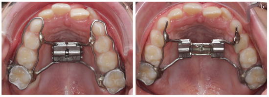Maxillary expansion with a Hyrax expander. (a) Before transversal expansion. The lateral primary teeth were lingually and buccally strengthened by a curved wire. (b) After transversal expansion. The curved wire loop was cut buccally and palatally fixed with a composite at the primary canines.