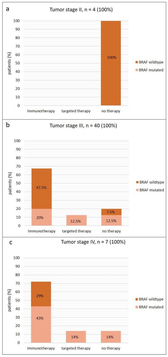 Additionally, we analyzed the patients’ therapy in conjunction with their tumor stage and BRAF status (Figure 1). All four patients with tumor stage II were BRAF wildtype (100%) and all of the patients (100%) received no therapy (Figure 1a).
