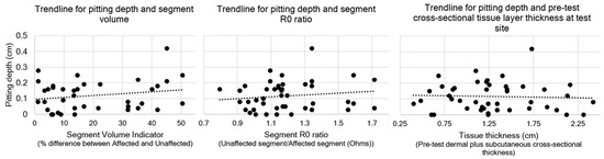 Trendlines for pitting depth and segment volume, segment R0 ratio, and tissue thickness. Dots indicate the individual results, trendline indicated by dotted line. Traditional indicators of oedema do not correlate with pitting depth. It is reasonable to infer that other factors contribute to tissue pitting.