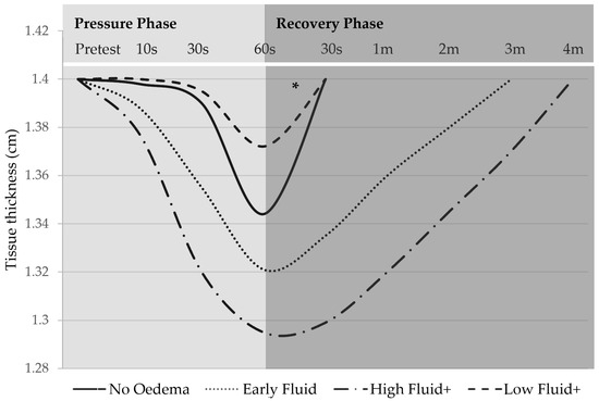Timeline of tissue thickness change throughout pressure and recovery phases of the pitting test: Representation of LOCAL category trends. Graph generated using LOCAL subgroup data including: Average tissue thickness change at 60 s; average recovery time; the trend observed over the duration of pressure and recovery phases for sites approximating 1.4 cm cross-sectional thickness prior to pitting test. Pitting depths are representative of the data collected with the weight of an ultrasound standoff in situ reducing the magnitude of the measured pit. s—seconds; m—minutes. * The first measurement was taken 30 s into recovery after the pitting test; No Oedema and Low Fluid groups could have recovered beforehand.